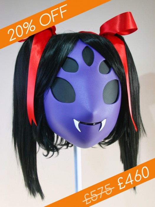This is a premade purple spider mask based on Muffet from Undertale. The fibreglass shell is full enclosure, with a hinged section that is held closed by magnets. The eyes are perforated steel mesh, and the interior padding is removable for cleaning and adjustment. The hair is Coscraft black, with removable clip-on ponytails.